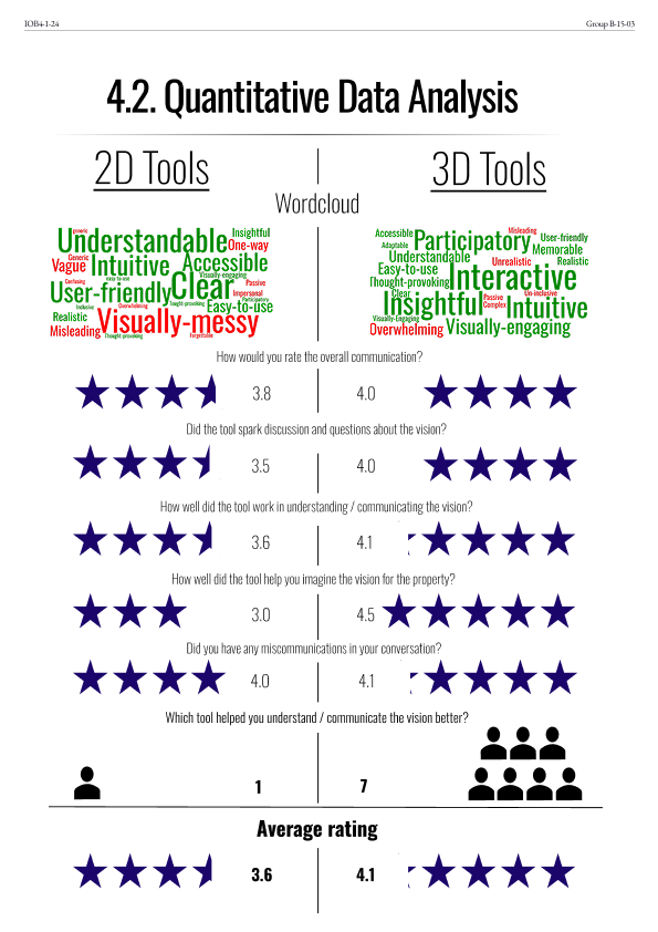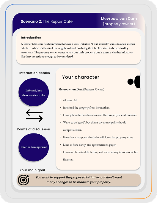 To test both 2D tools and 3D tools in communication effectiveness, 2 different scenarios were created, each having 2 character briefs; 1 for the property owner, and 1 for the initiator. Enough information has been given for the participants to get into the role, but there is still room for the participants to interpret the character in their own way, making the conversation more natural. The modular building kit lead to a more effective conversation according to the participants.